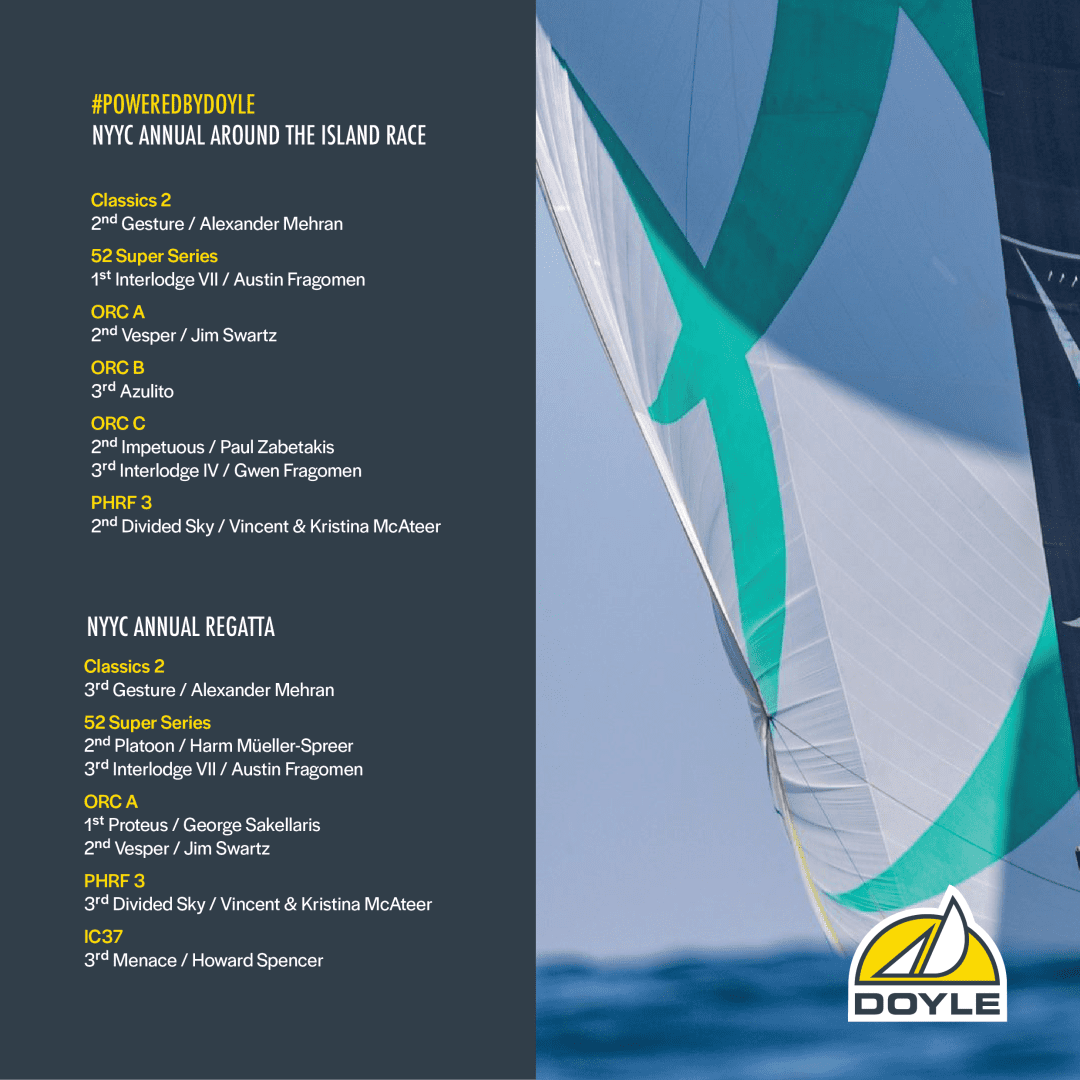 The well attended NYYC ANNUAL REGATTA and NYYC ROUND THE ISLAND RACE saw teams from all over join for a weekend of close racing alongside the 52 Super Series held in conjunction. Doyle-powered teams taking podium spots in the Round the Island race