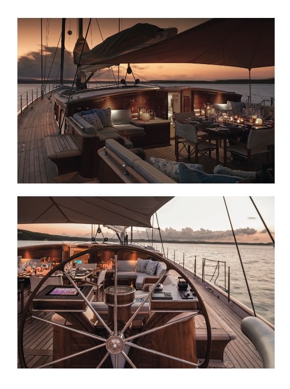 Technically, it’s a similar story. Royal Huisman calls her a NextGEN Ketch, because she benefitted from a new way of thinking about power management on board. The key here is her variable speed generators, which are lighter, quieter and up to 10 per cent more fuel-efficient than their conventional counterparts. A large lithium battery bank can mop up any excess power or boost generator output when demand is high.